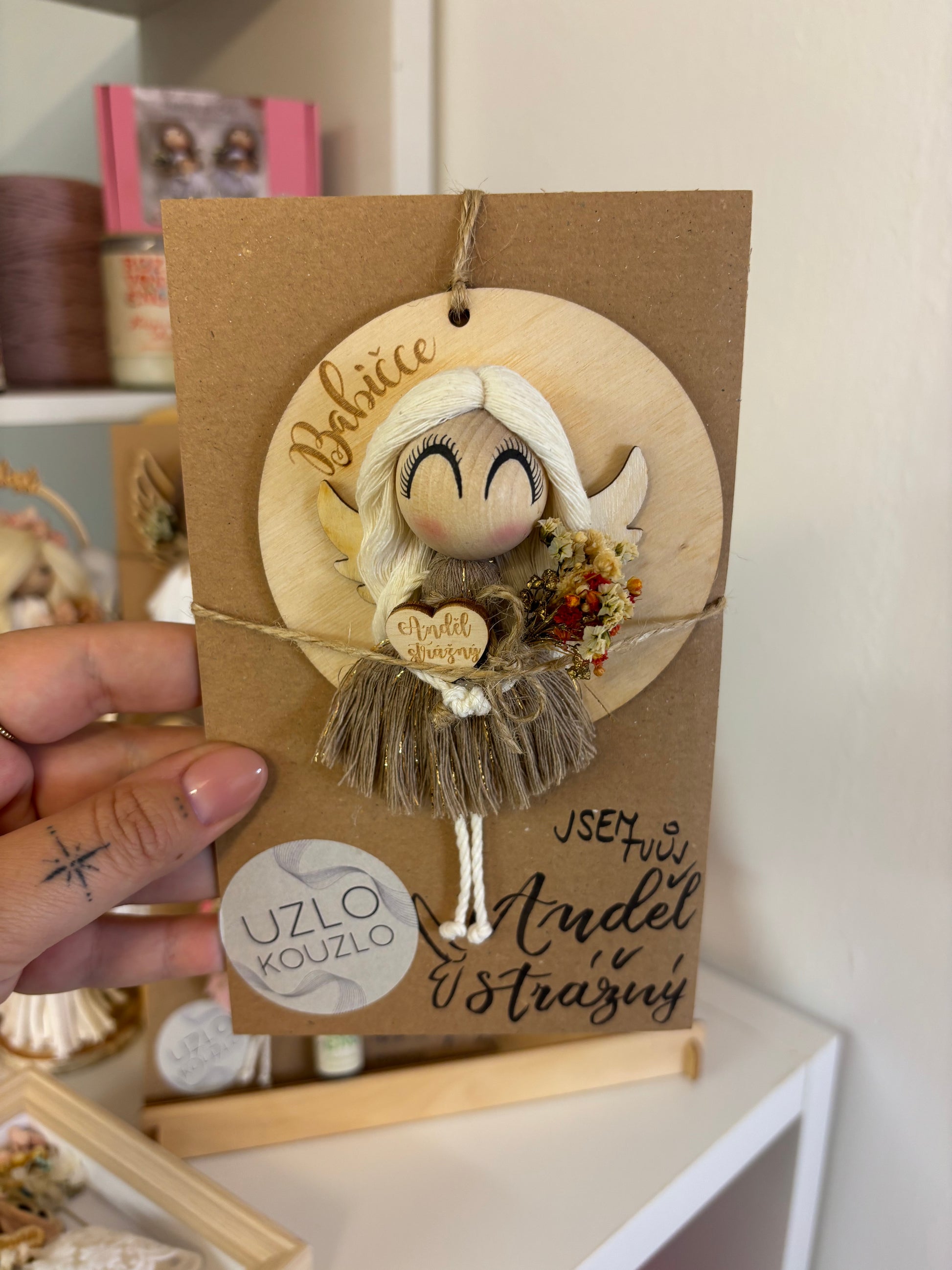 Andělka na dřevěném kolečku Babičce, béžovo - zlatá