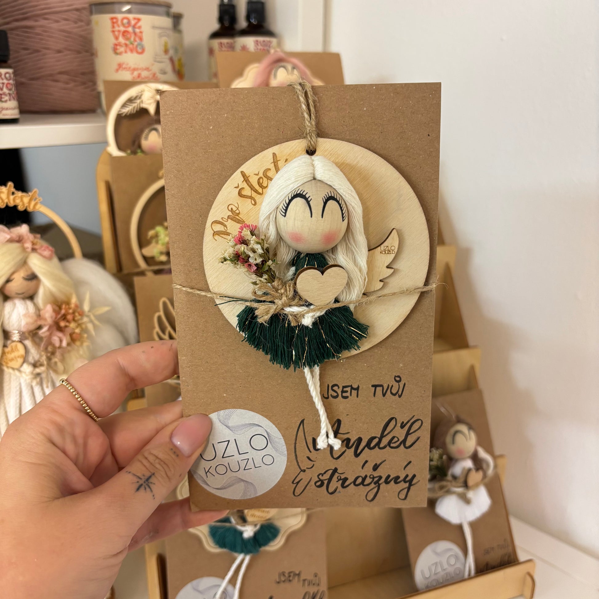 Andělka na dřevěném kolečku Pro štěstí, zelená