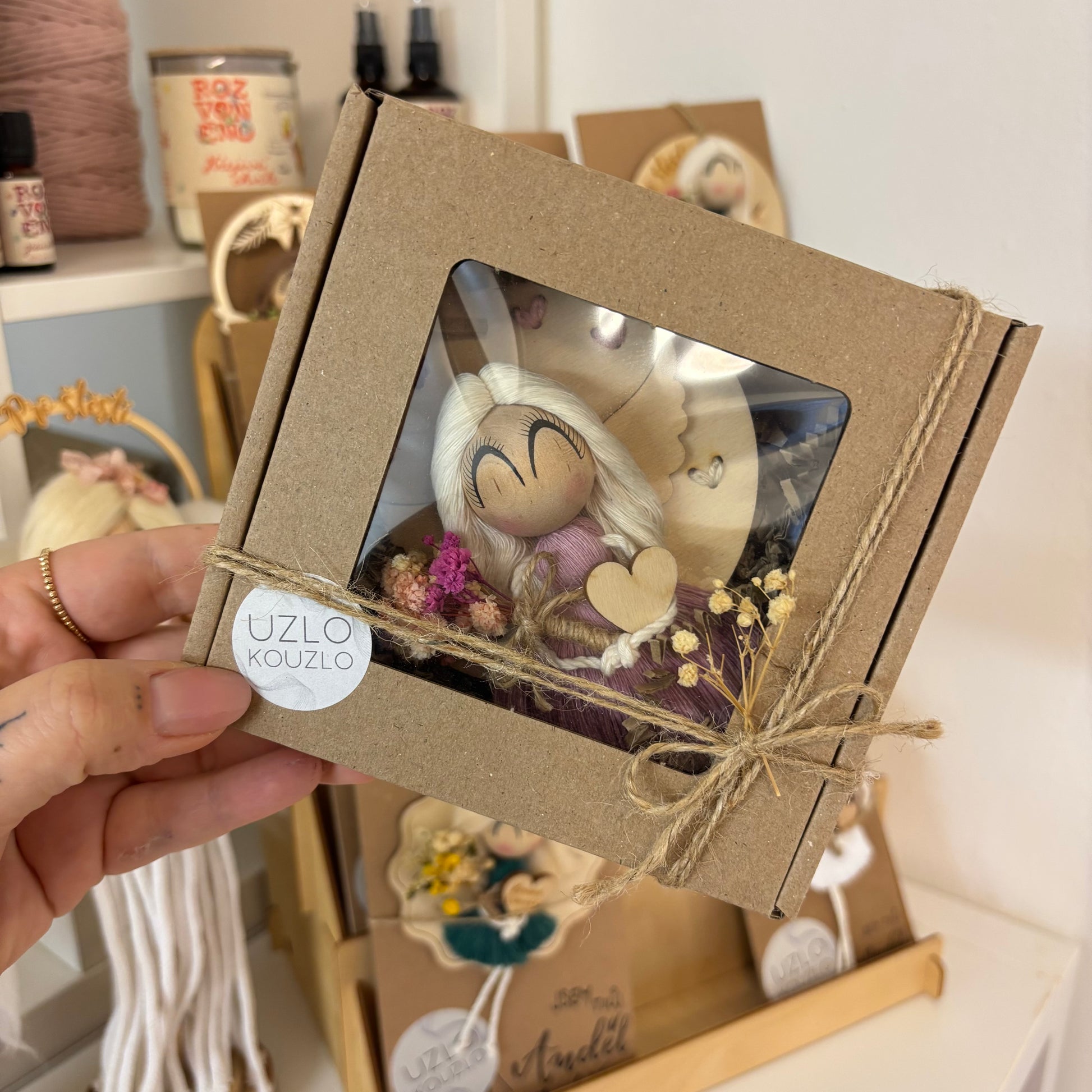 Andělka na dřevěném kolečku o průměru 10cm, na kterém jsou vyšitá srdíčka.