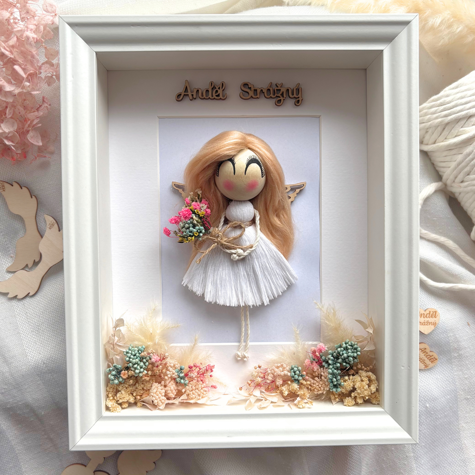 Ručně vytvořený anděl strážný umístěný ve 3D rámečku. Anděl je chráněný pod "sklem".