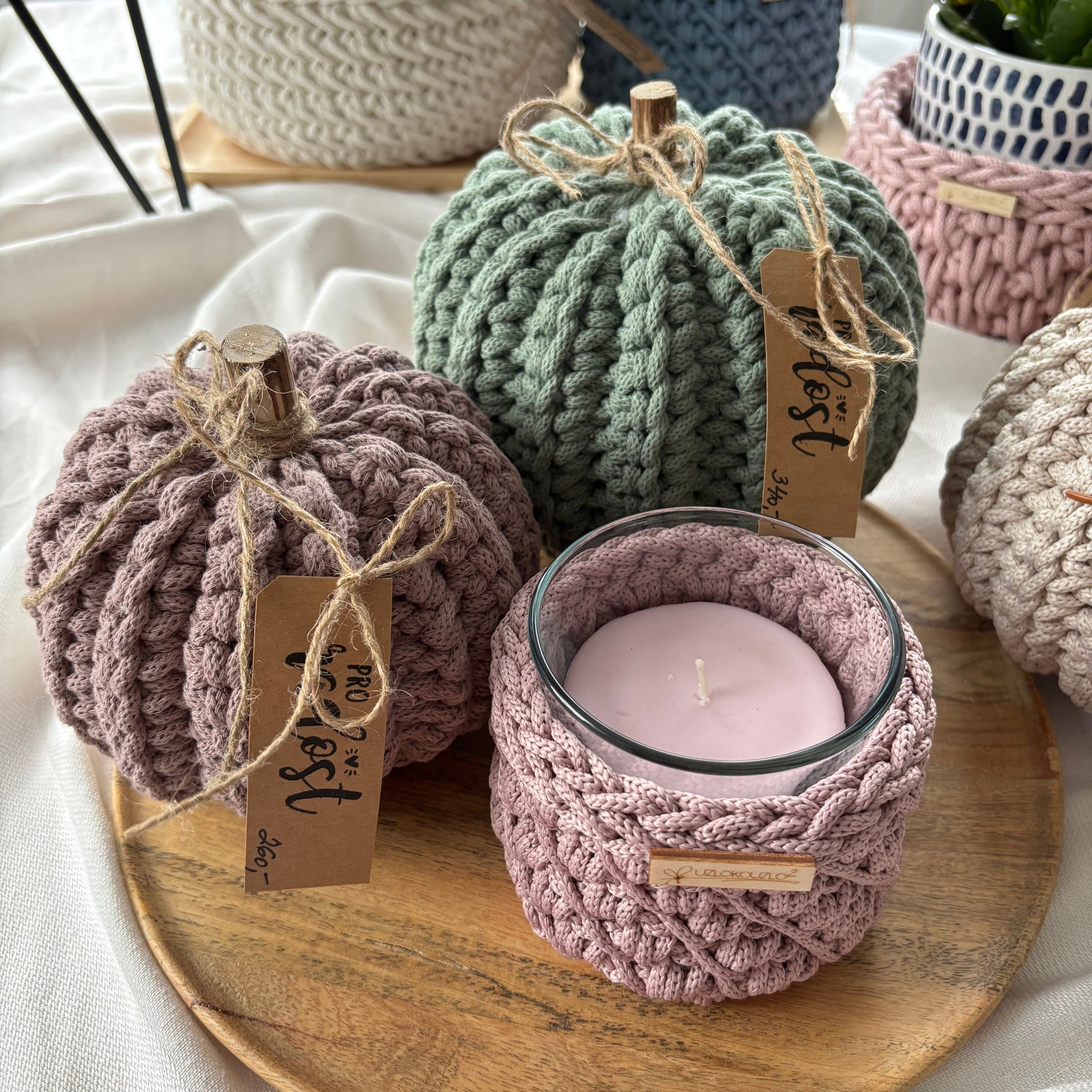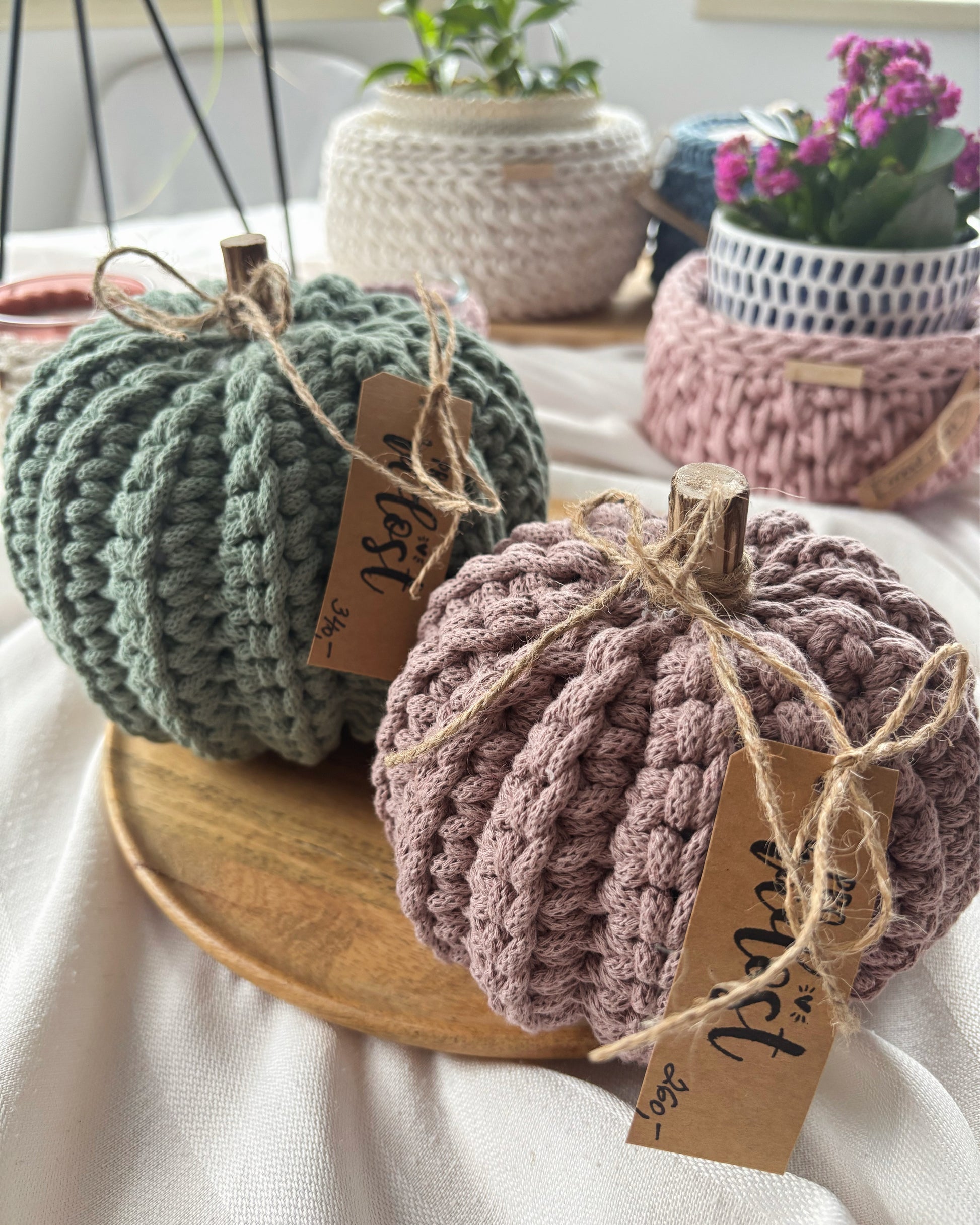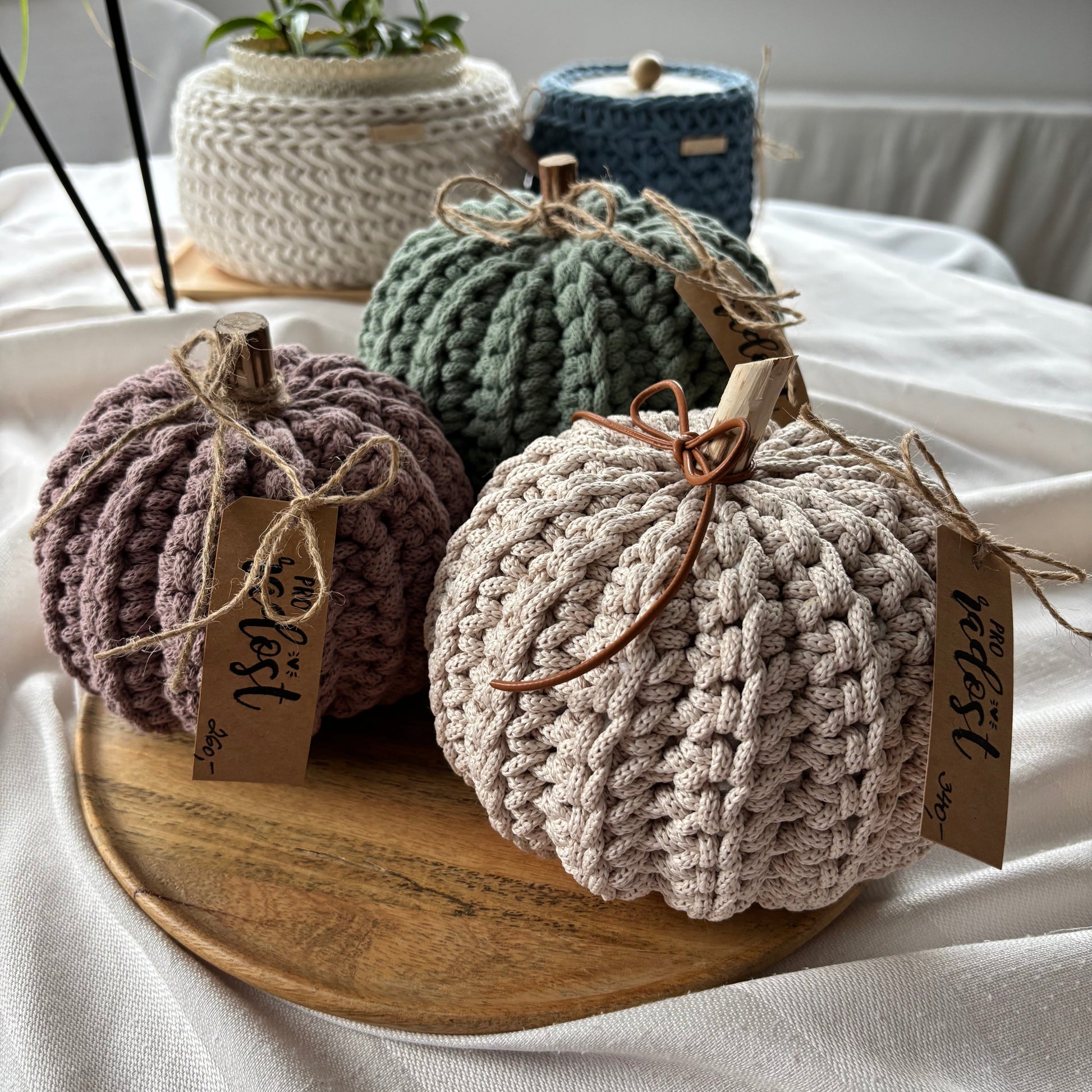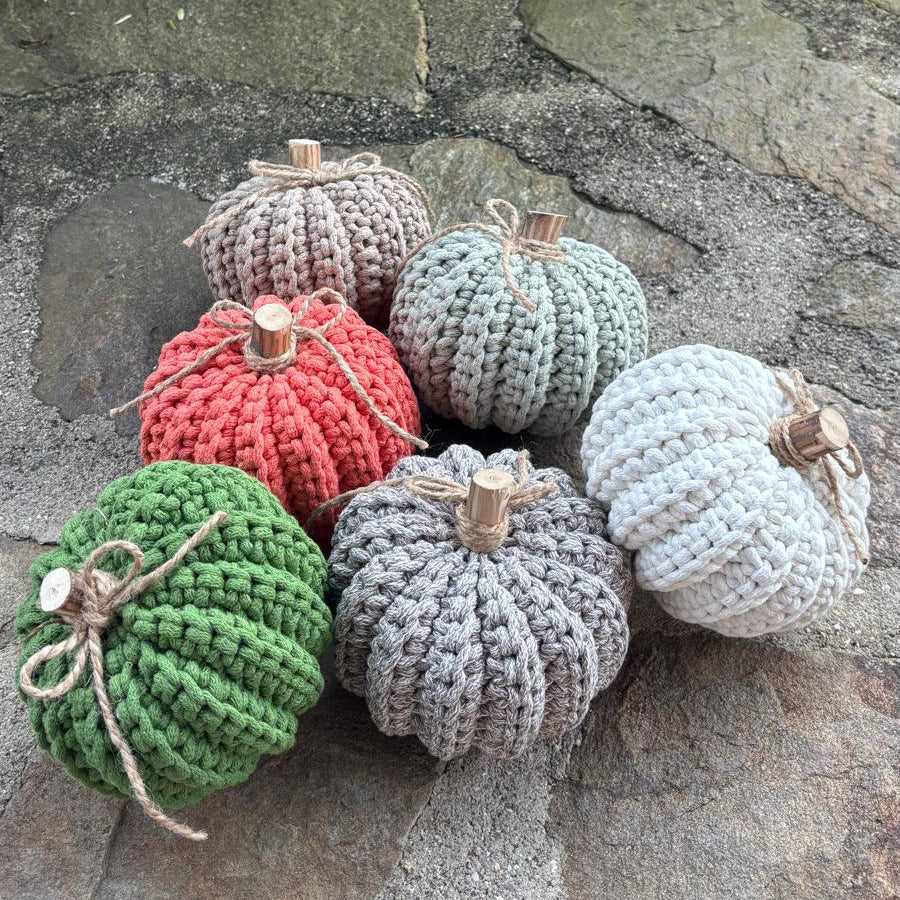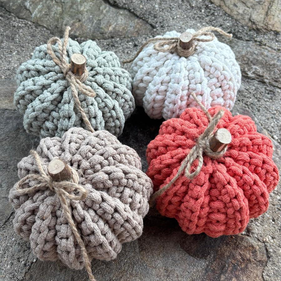Každá dýně je ručně háčkovaná z kvalitní, pevné příze a doplněná přírodním dřevěným stonkem a jutovou mašlí. Díky poctivé ruční práci je každý kus originál.